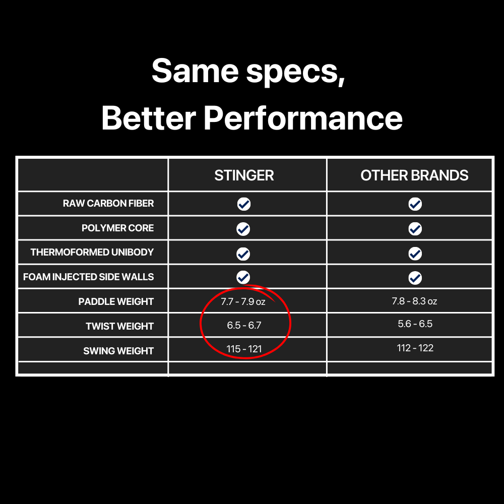 For the best playing experience, you want an ultralight paddle with a high twist weight. That’s the ideal combination—and Stinger Paddles deliver it.